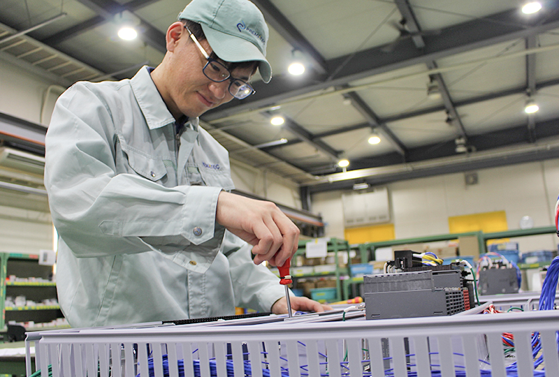 組立課の作業では、自分たちで電装盤に機器取付用の穴をあける作業から、装置に電気を入れ正常に動作するかの確認までの一連の流れを行います。そのため、問題なく装置に電源が入り動作した時は嬉しくやりがいを感じます。
